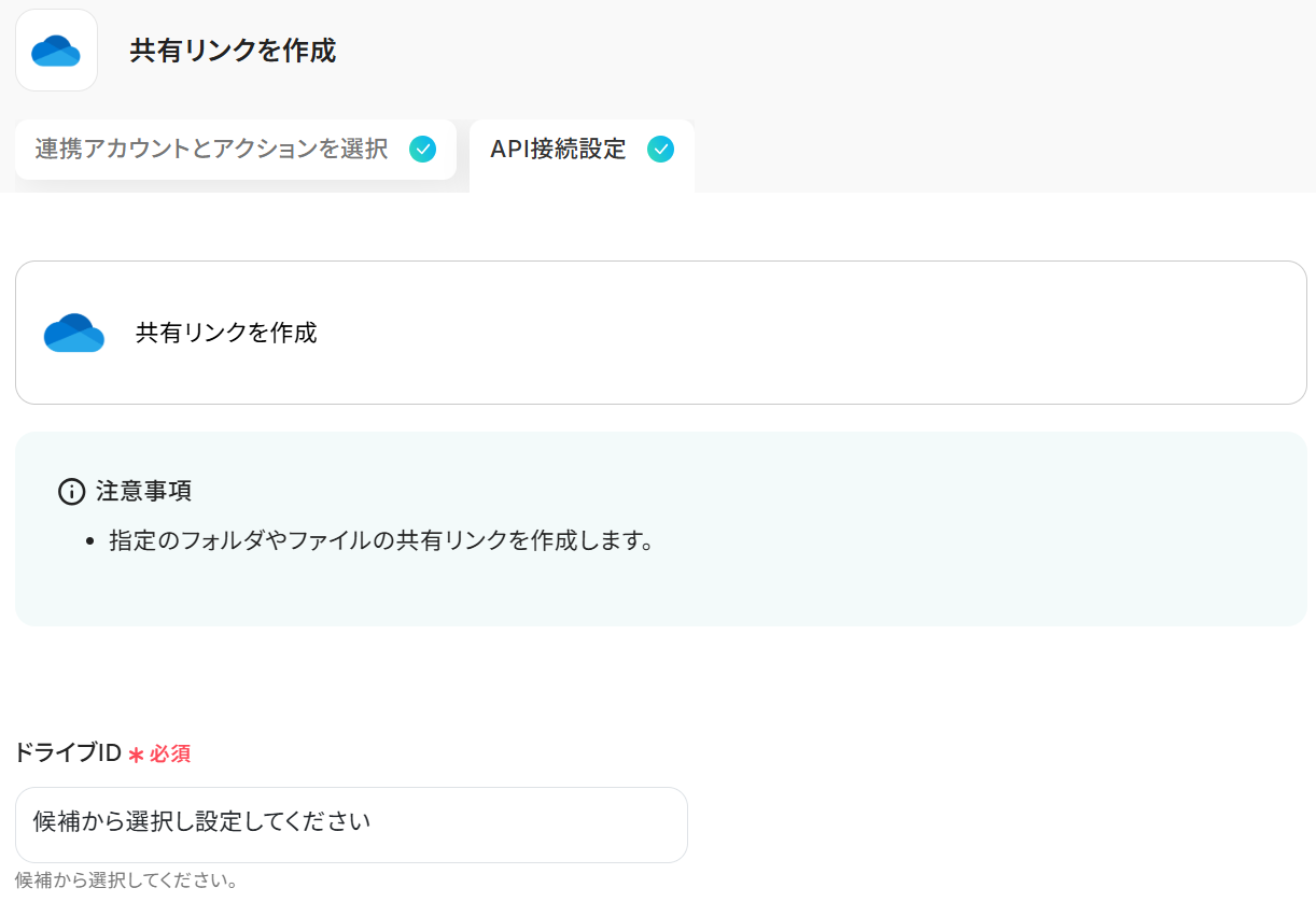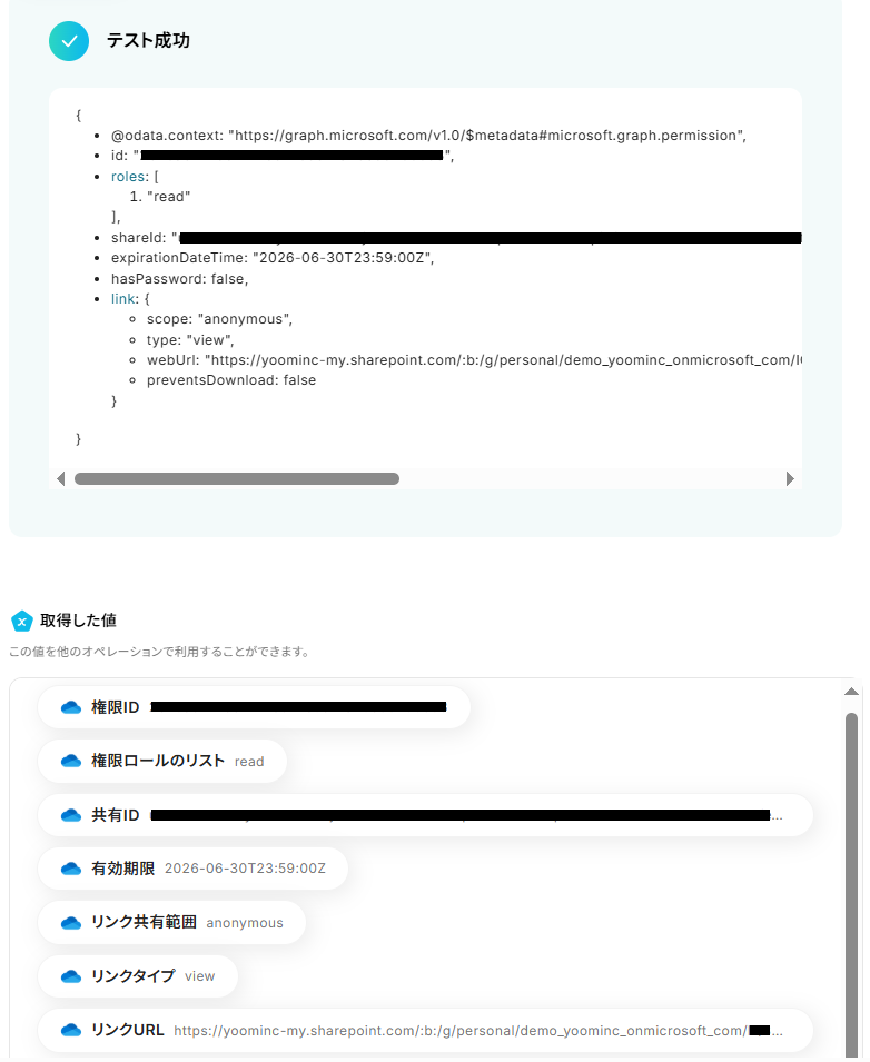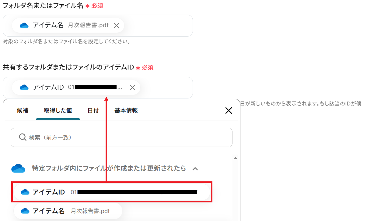 フォルダ名またはファイル名・共有するフォルダまたはファイルのアイテムIDの欄には、OneDriveから取得した値が予め設定されているのでそのままで大丈夫です。