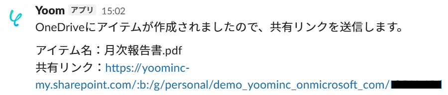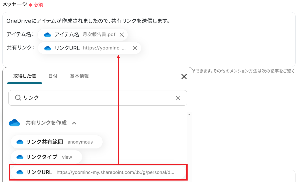 メッセージ本文には、OneDriveから取得したファイル名などの情報を埋め込むことが可能です。