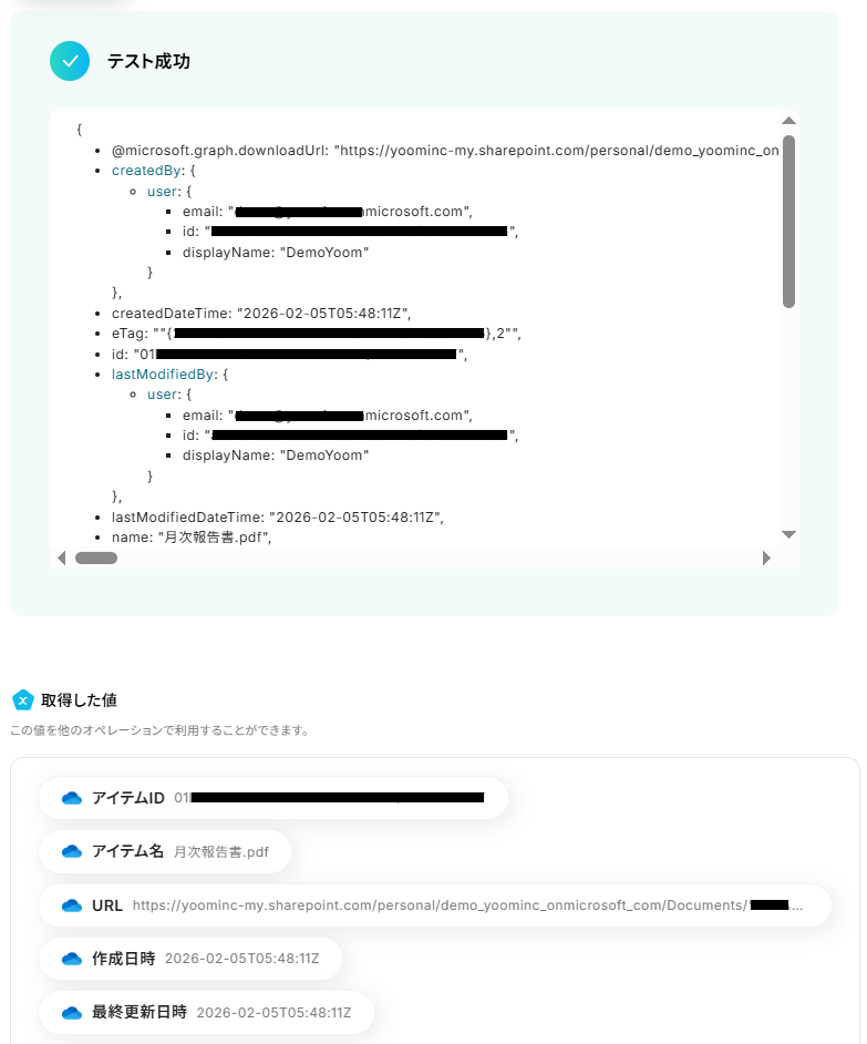 トリガーやオペレーション設定時に、「テスト」を実行して取得した値のことを指します。