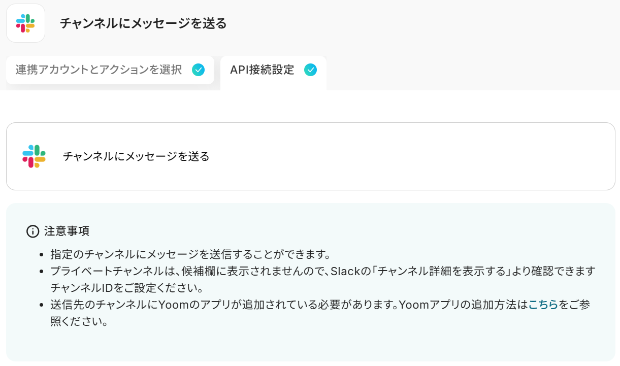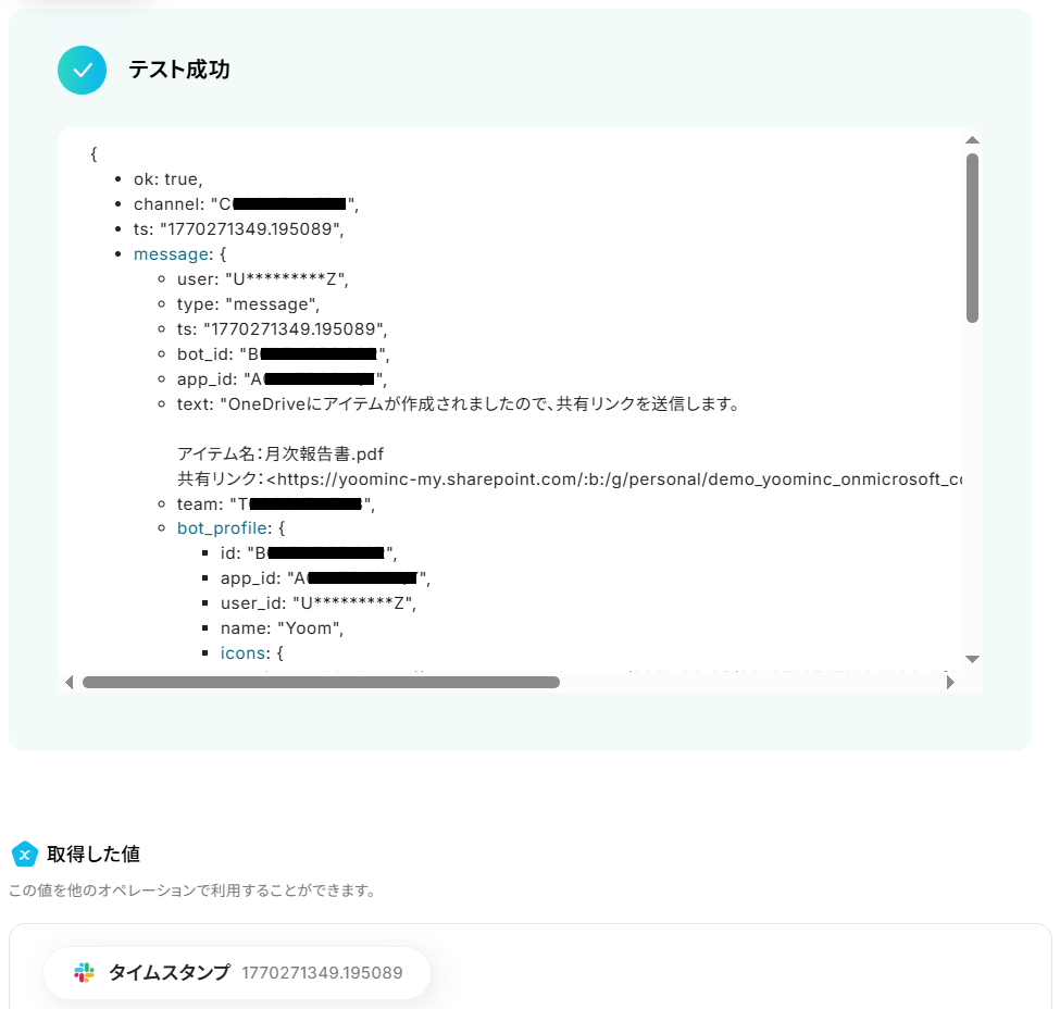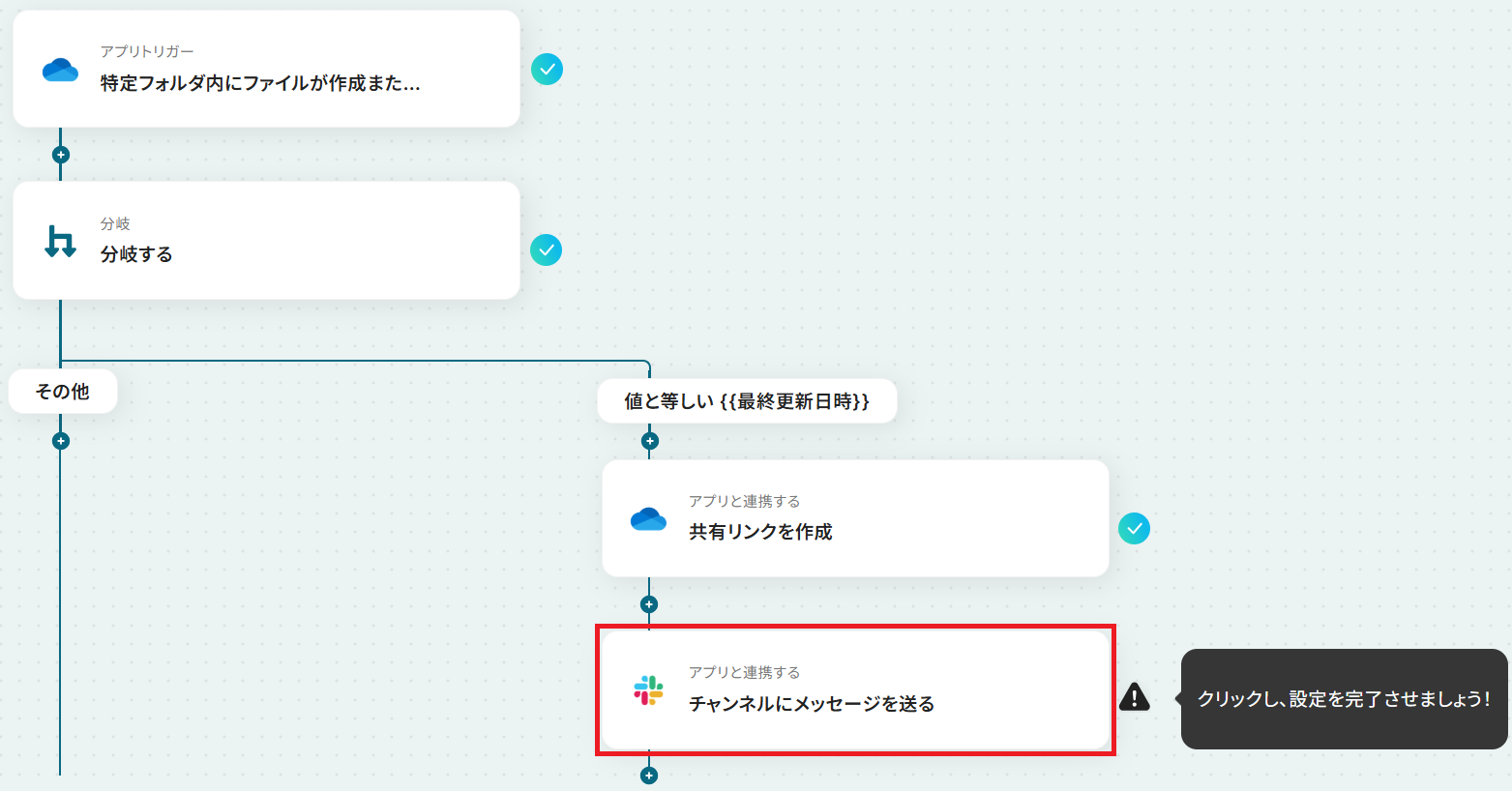 - 最後に、オペレーションでSlackの「チャンネルにメッセージを送る」アクションを設定し、作成した共有リンクを任意のチャンネルに通知します。