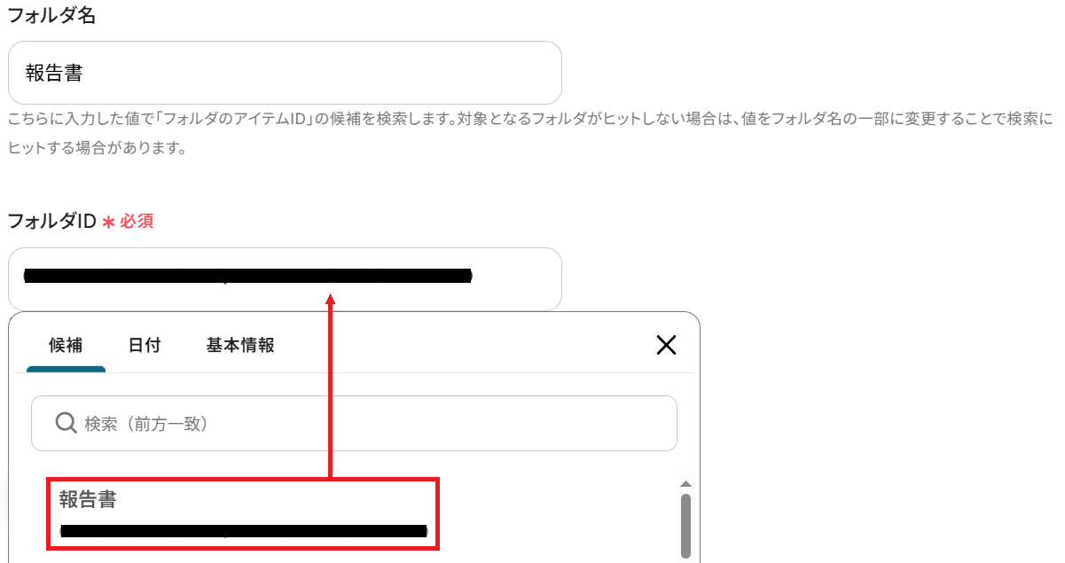 フォルダ名の欄に該当のキーワード(今回でいうと「報告書」)を入力すると、フォルダIDの候補が絞られます。