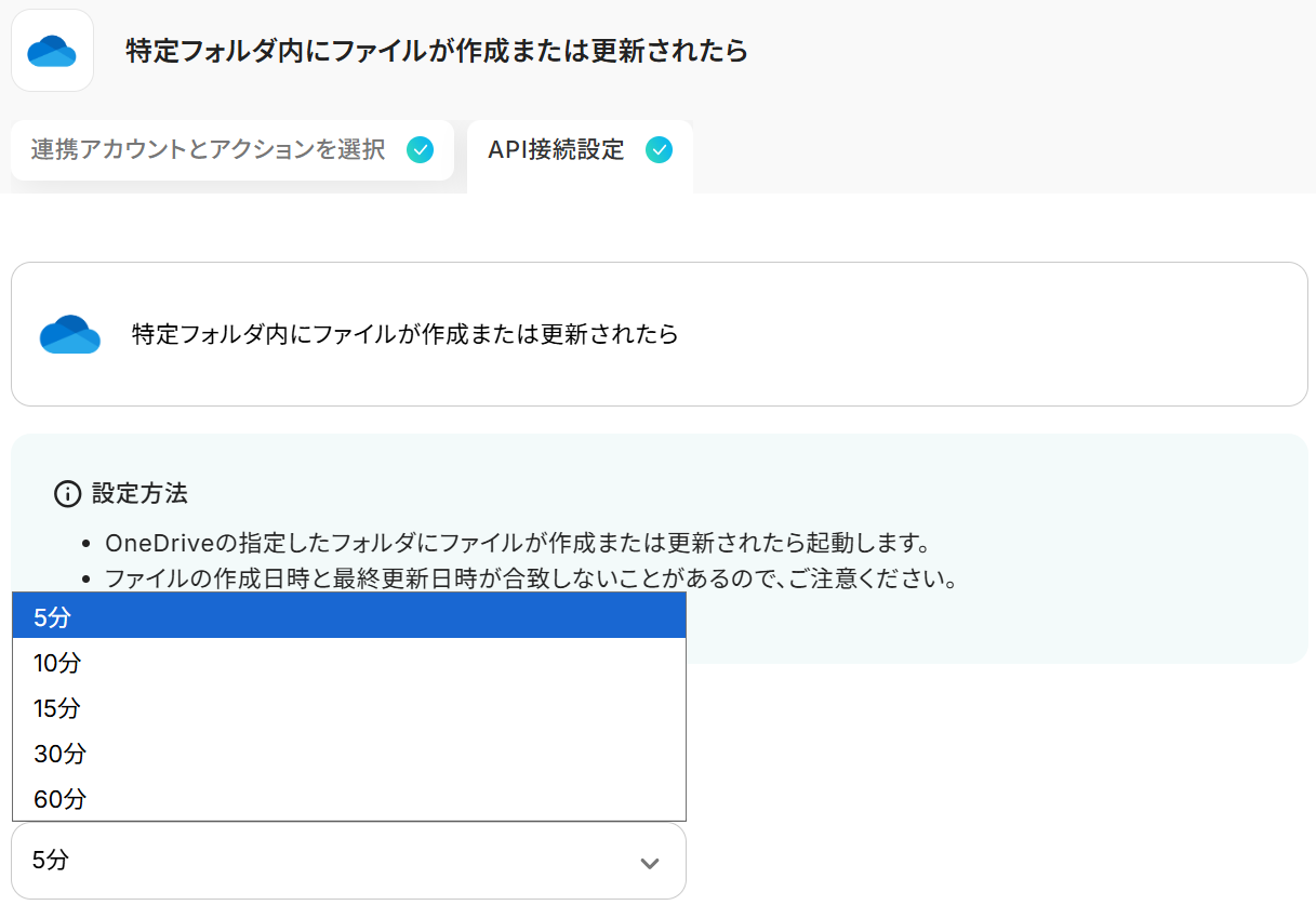 - トリガーは5分、10分、15分、30分、60分の間隔で起動間隔を選択できます。