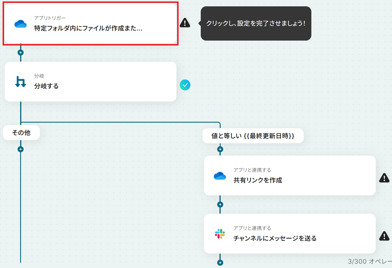 - OneDriveのトリガー、分岐設定、OneDriveとSlackのアクション設定