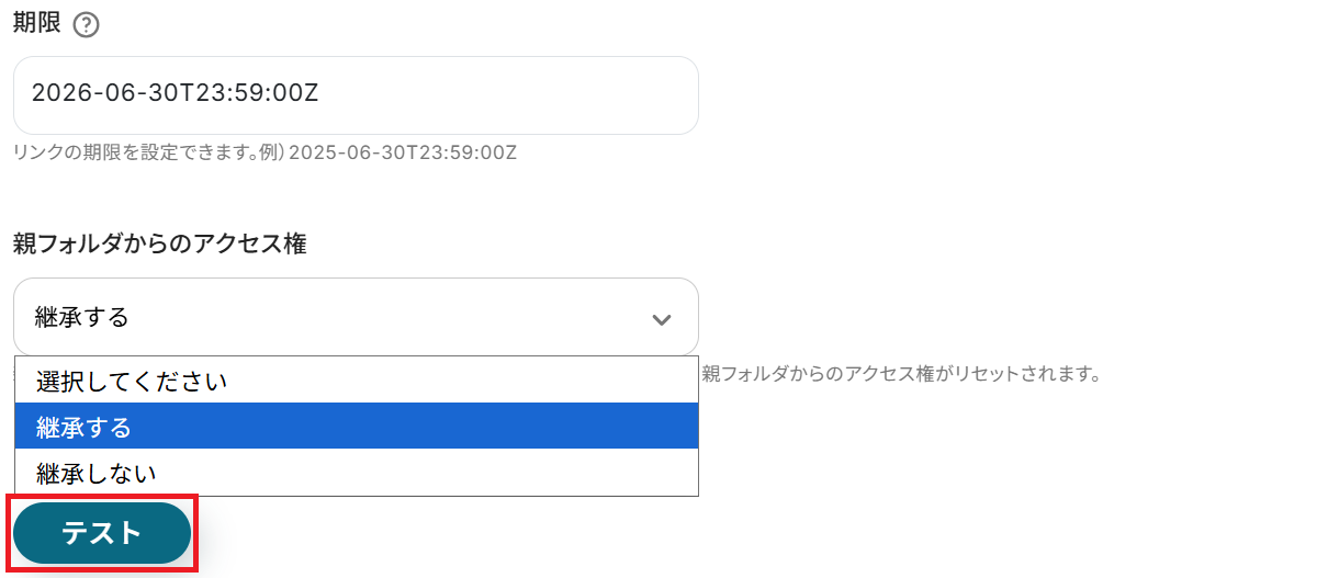 最後に任意でリンクの期限を入力し、親フォルダからのアクセス権を継承するか否か選択してテストしましょう。