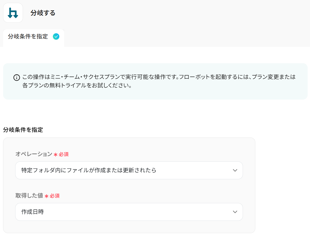 - 分岐はミニプラン以上のプランでご利用いただける機能(オペレーション)となっております。フリープランの場合は設定しているフローボットのオペレーションはエラーとなりますので、ご注意ください。