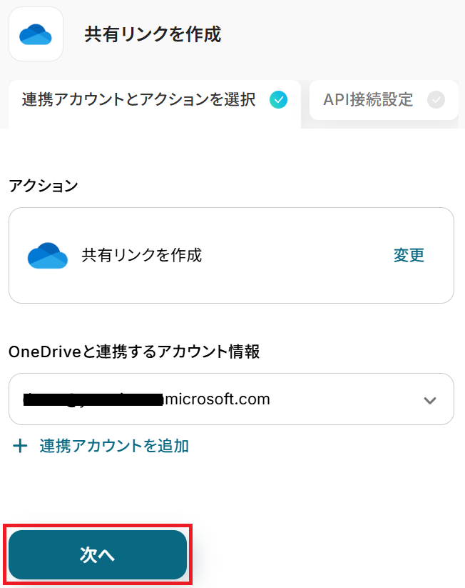 ステップ3と同様、アクションは「共有リンクを作成」のまま「次へ」をクリックします。