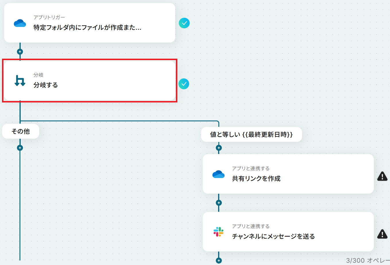 ※「分岐する」オペレーションは、ミニプラン以上でご利用いただけます。フリープランで利用するとエラーになってしまうのでご注意ください。