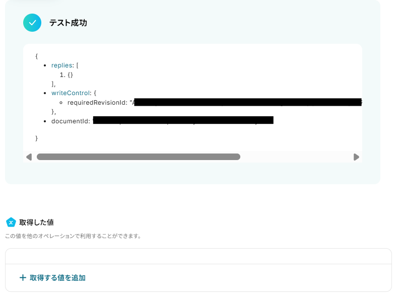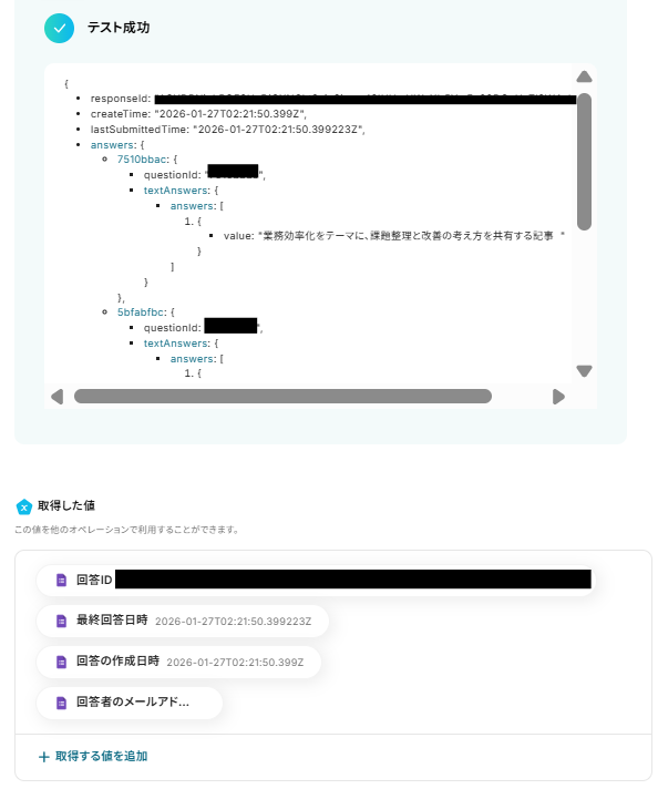 入力ができたら「テスト」ボタンを押してみましょう。連携が成功すると以下のように取得した値が入りますが、このままでは回答内容の文章が取得できていません。