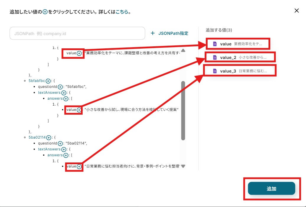 取得した値に追加したい値の「+」ボタンを押して、追加ボタンを押します。