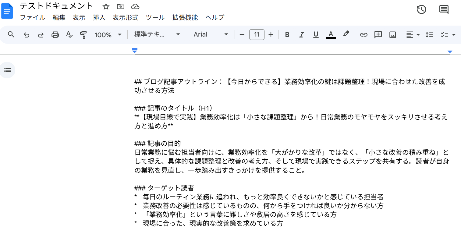 今回はアウトライン反映用に、Googleドキュメントに下記のようなドキュメントを作成しました。