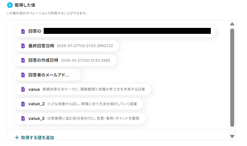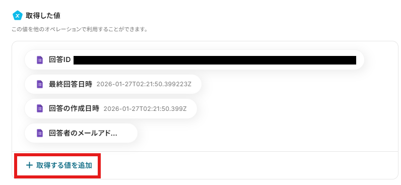 取得した値の下部にある、「+取得する値を追加」をクリックします。