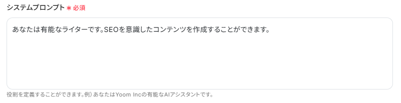 「システムプロンプト」「ユーザープロンプト」はデフォルト設定のまま、以下のように入力してあります。ご確認ください。