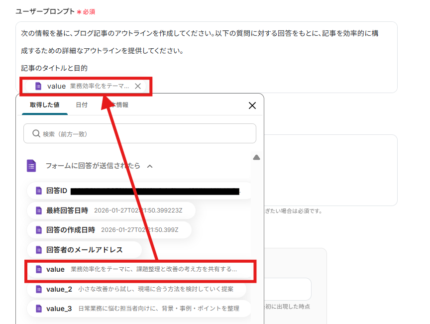 「ユーザープロンプト」に取得した値を使っていますが、取得した値を活用すると、固定値ではなく、トリガーが実行されるたびに最新の情報が反映できます。