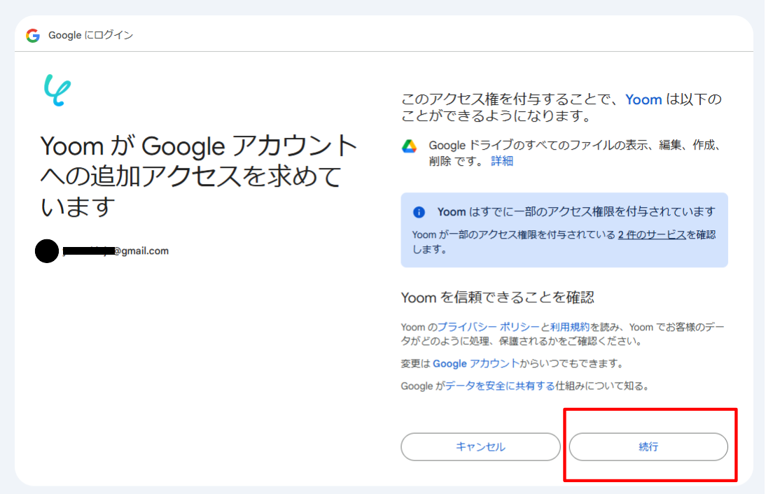 連携アカウントと内容を確認の上、「続行」をクリックしましょう。