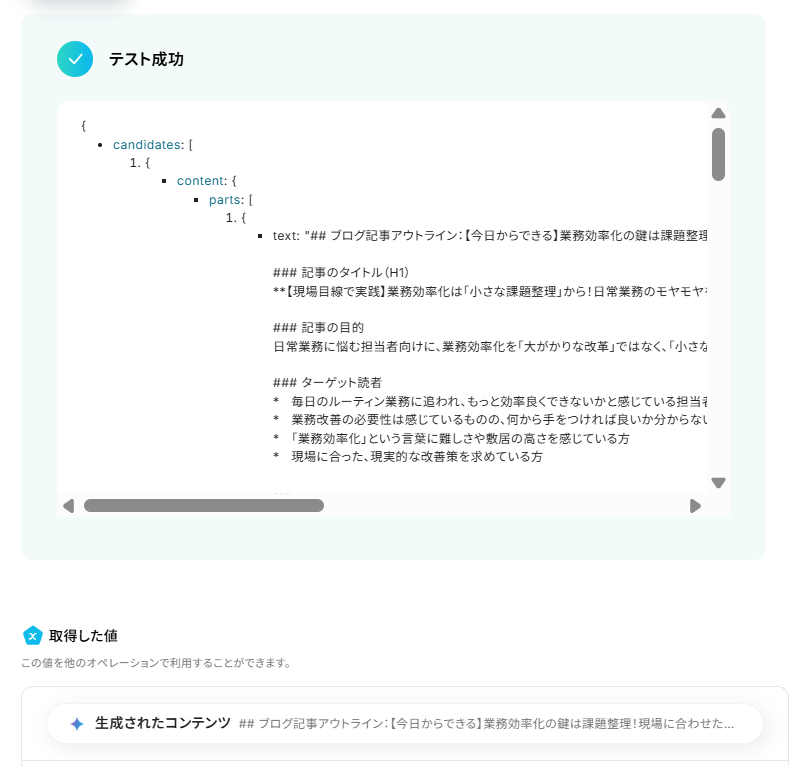 上記入力が完了したらテストボタンをクリックします。テストが成功してテキストが生成され、取得した値に反映されればOKです。