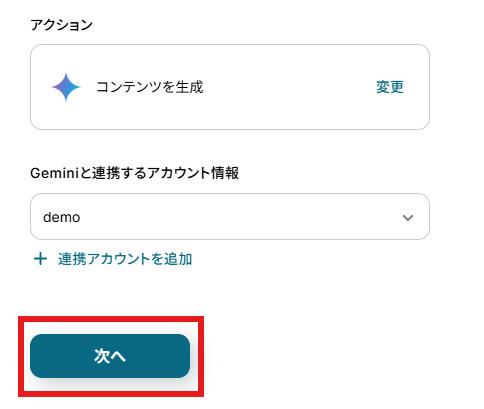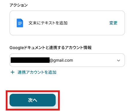 アクションはデフォルト設定のまま、アカウント情報は、連携したいアカウントが選択されているか確認してください。確認が終わったら「次へ」で進みましょう。