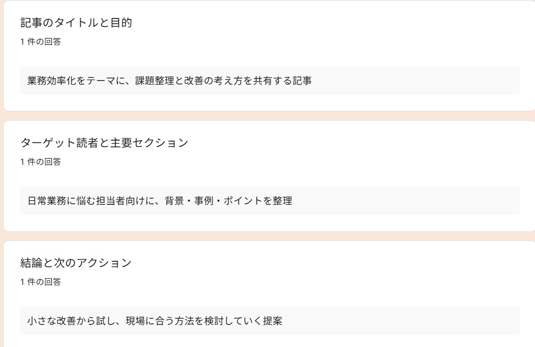 まとめ GoogleフォームとGeminiの連携を自動化することで、これまで手作業で行っていたフォーム回答の整理やアウトライン作成にかかる時間と手間を削減できます。 これにより、アイデア出しから構成案作成までのプロセスがスムーズになり、より質の高いコンテンツを生み出すための創造的な業務に集中できる環境整備が可能です!