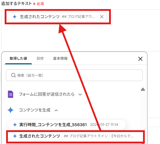 「追加するテキスト」は、取得した値から生成されたコンテンツを選択してください。