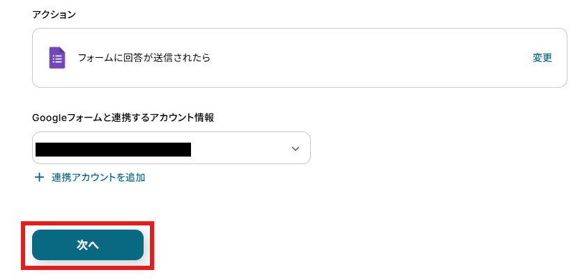 アクションはデフォルト設定のまま、アカウント情報は、連携したいアカウントが選択されているか確認してください。確認出来たら「次へ」をクリックしましょう。
