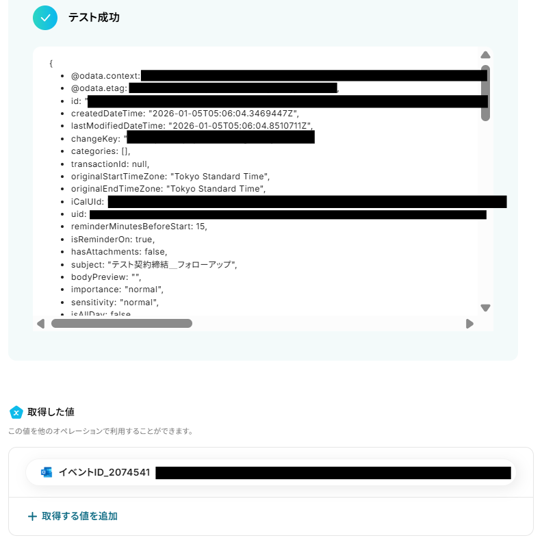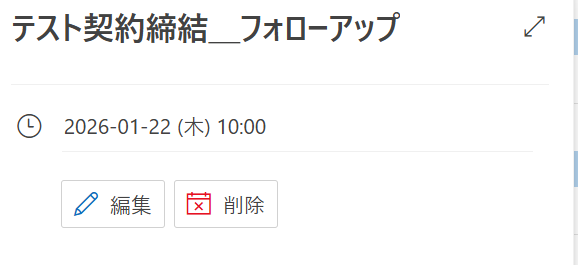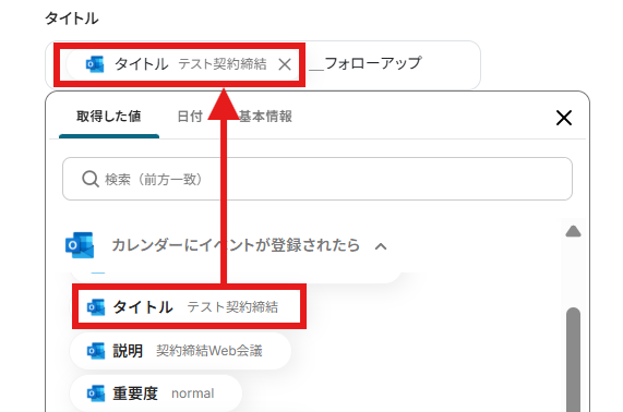 「タイトル」は取得した値から契約締結時の予定のタイトルを選択し、「_フォローアップ」を付けて契約締結に関するフォローアップの予定とわかるように設定しました。
