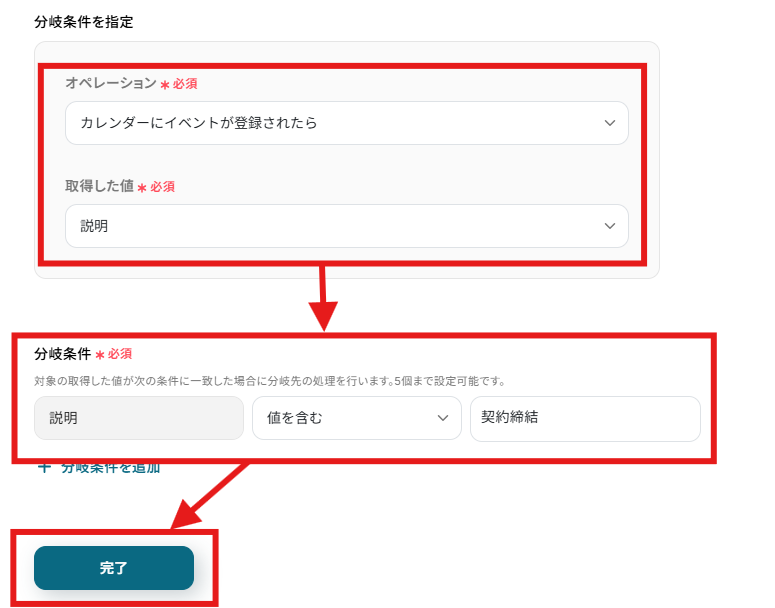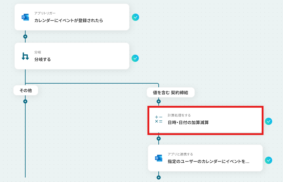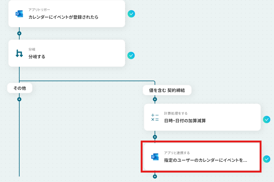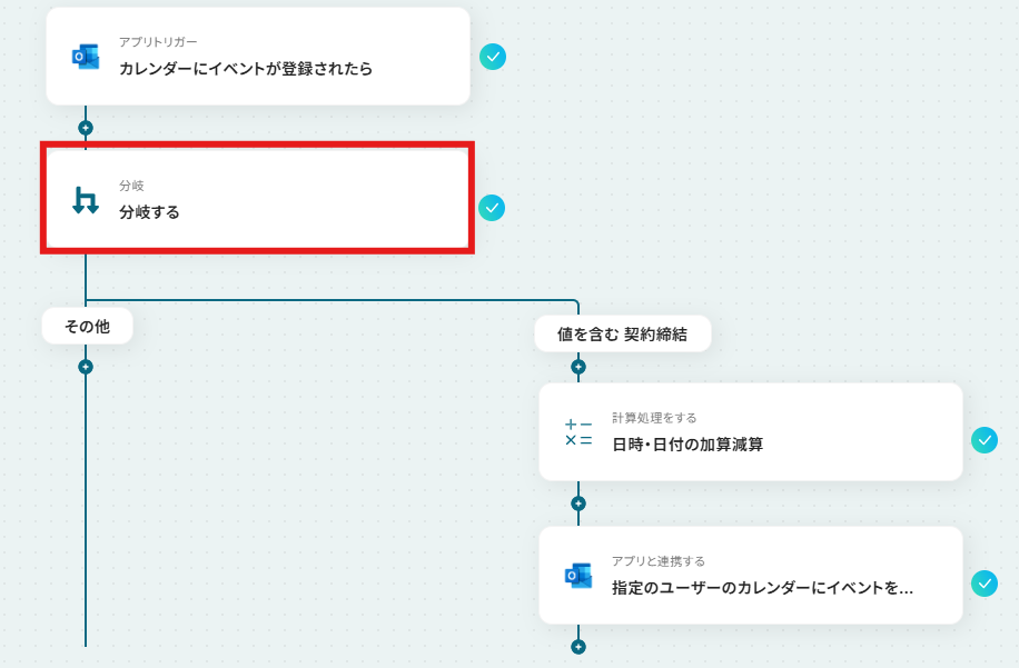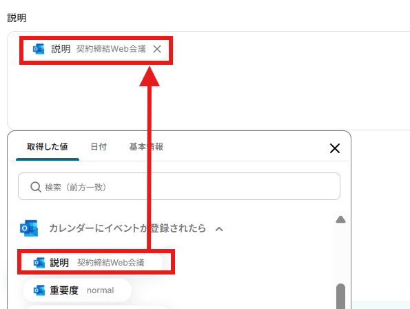 今回は取得した値の「説明」に「契約締結」という文言が入っている予定のみフローを先に進めます。