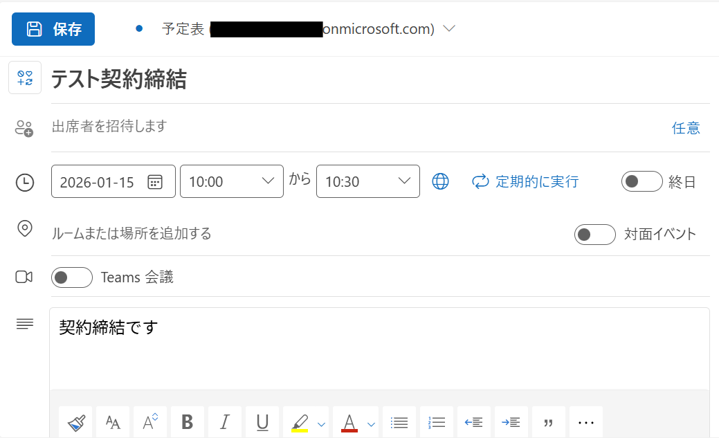ここまで終わったら、トリガーとして感知させたい予定をOutlookカレンダー上に作成しましょう。