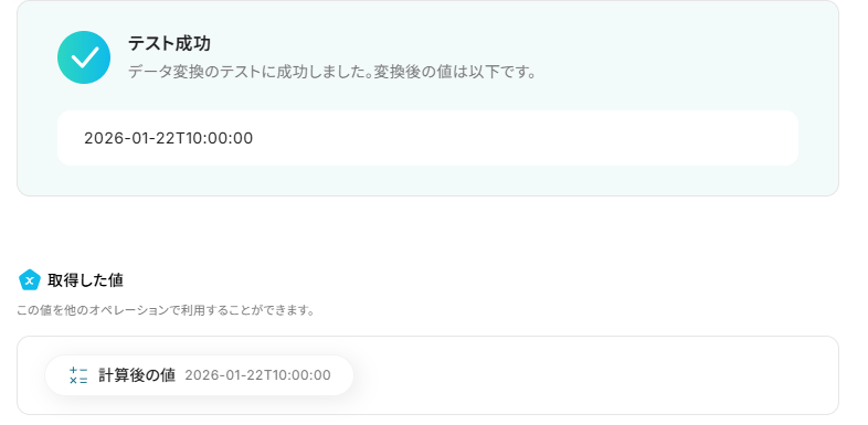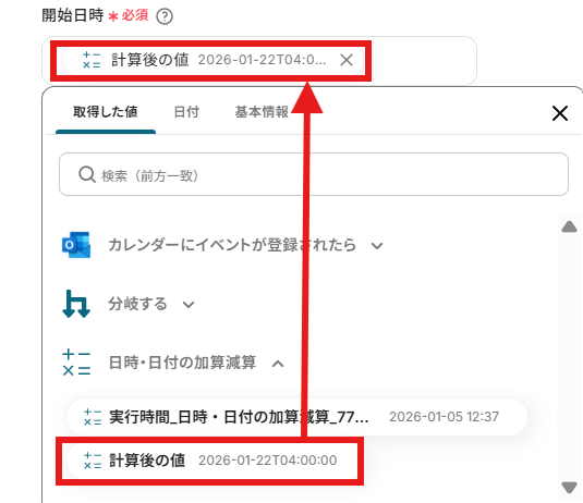 開始日時・終了日時は「計算後の値」を、計算時に取得した値から入力してください。