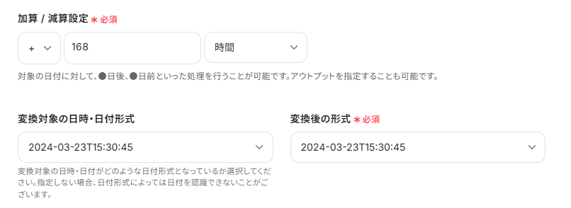 「変換対象の日時・日付形式」と、「変換後の形式」はデフォルトで入力されていますが、日時の形式が以下のような形にきちんと指定できているか確認してください。