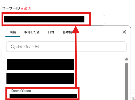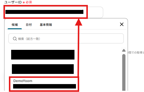 「ユーザーID」 は、マイアプリ連携がうまくいっていれば候補に表示されますので、そちらから選択してください。