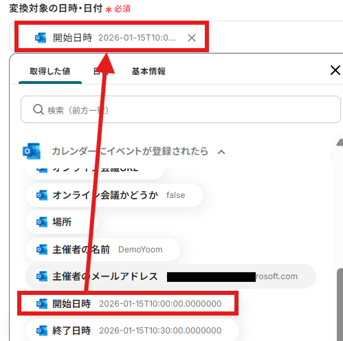 変換対象の日時・日付には、Outlookカレンダーから取得した値より、予定の「開始日時」を選択してください。
