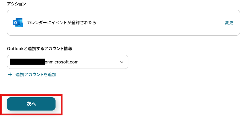 連携するアカウント情報を確認し、アクションはテンプレート通りのまま「次へ」をクリックして進んでください。