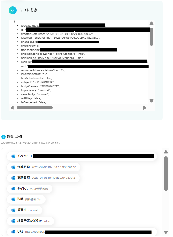- Outlookで新しく作成する予定のタイトル、開始日時、終了日時、本文などの内容は、任意の値やトリガーから取得した情報を組み合わせて設定できます。