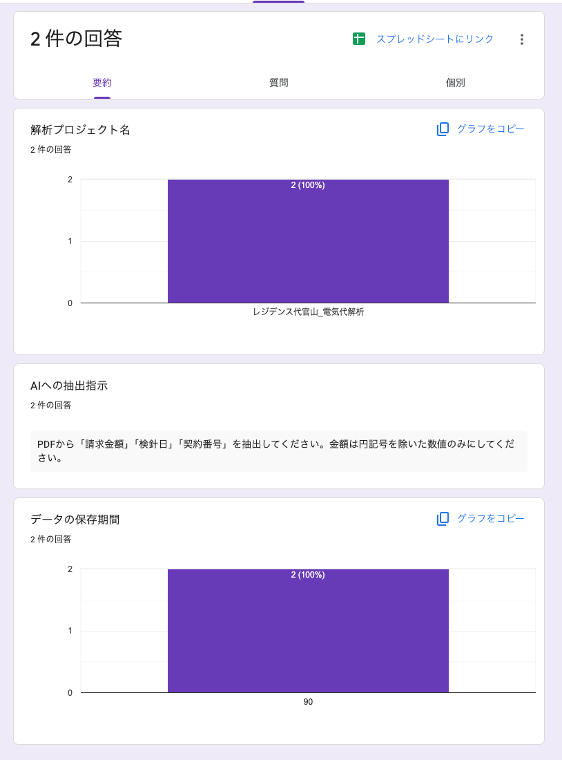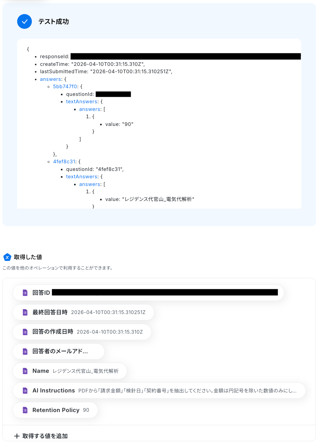 テストに成功すると、Googleフォームに送信された回答に関する情報が一覧で表示されます。