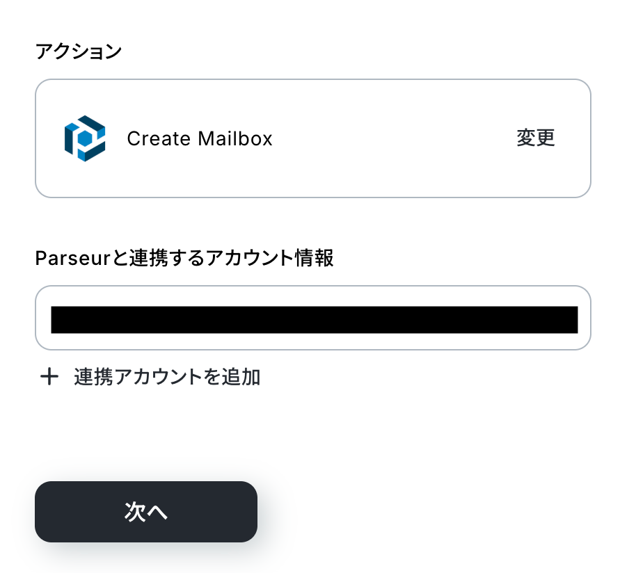 アクションはあらかじめ設定されているため、そのまま内容を確認してください。 Parseurと連携するアカウント情報に問題がなければ、「次へ」をクリックします。