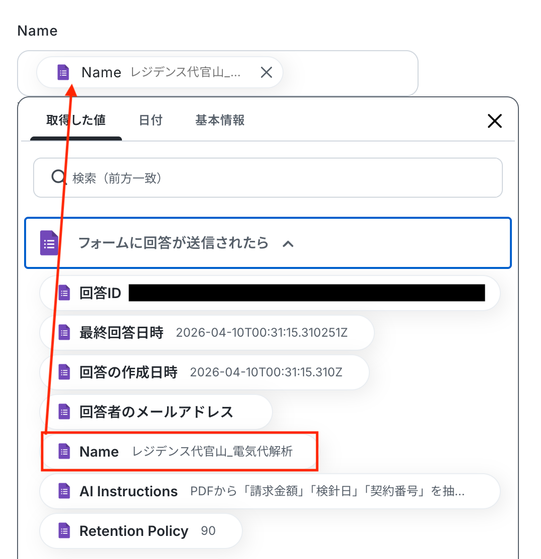 Name 入力欄をクリックすると、前のステップでGoogleフォームから取得した値が表示されるので、選択して入力しましょう。 取得した値を活用することで値が固定化されず、フローボットを起動するたびに最新の情報を自動で反映できます。なお、テキストを直接入力した部分は固定値とされるため、取得した値を活用せず設定を行うと毎回同じデータがParseurに登録されてしまうので注意が必要です。