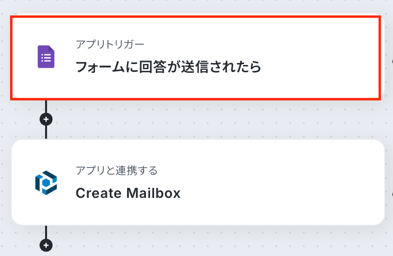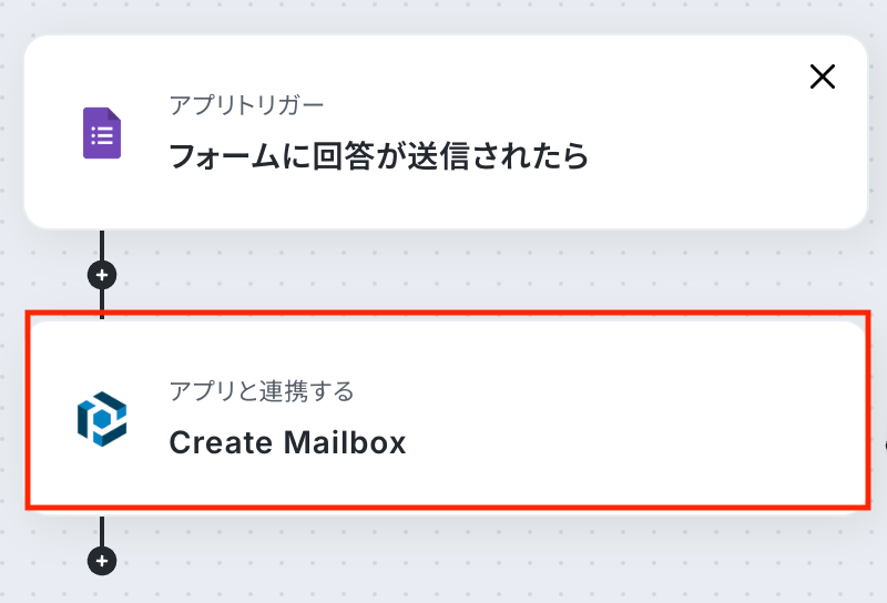 はじめに、GoogleフォームとParseurをYoomと連携します。 次に、トリガーでGoogleフォームを選択し、「フォームに回答が送信されたら」というアクションを設定します。 最後に、オペレーションでParseurを選択し、「Create Mailbox」のアクションを設定して、Googleフォームの回答内容をもとにメールボックスを作成します。 ※「トリガー」:フロー起動のきっかけとなるアクション、「オペレーション」:トリガー起動後、フロー内で処理を行うアクション■このワークフローのカスタムポイント