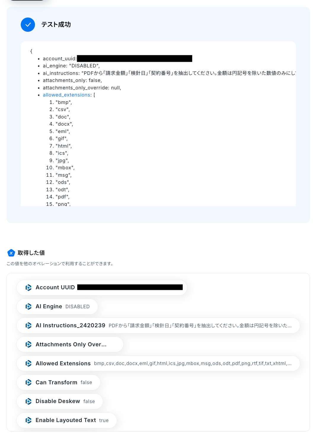 入力が完了したら「テスト」をクリックして、設定した内容でParseurにメールボックスが作成されるか確認しましょう。