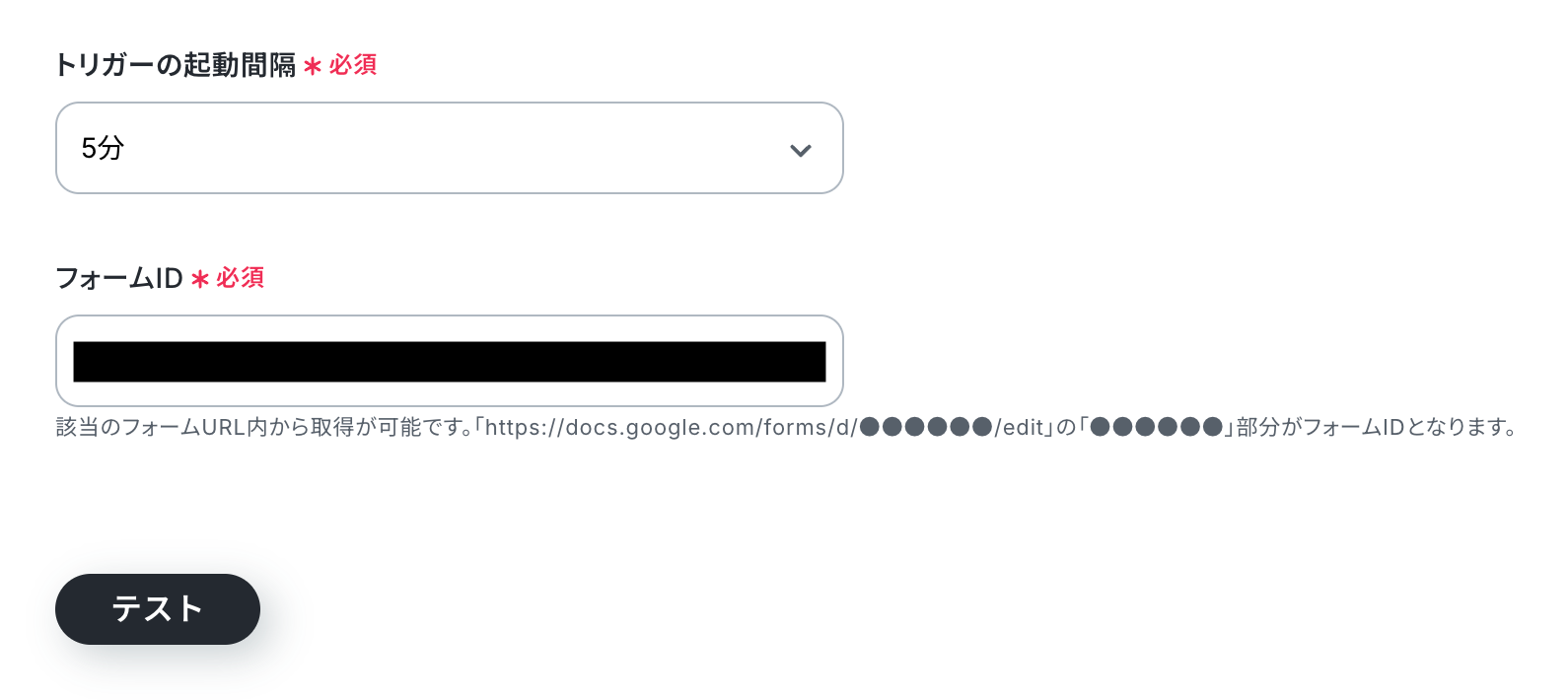 入力が完了したら「テスト」をクリックし、Googleフォームに送信した回答内容が正しく取得できるか確認しましょう。