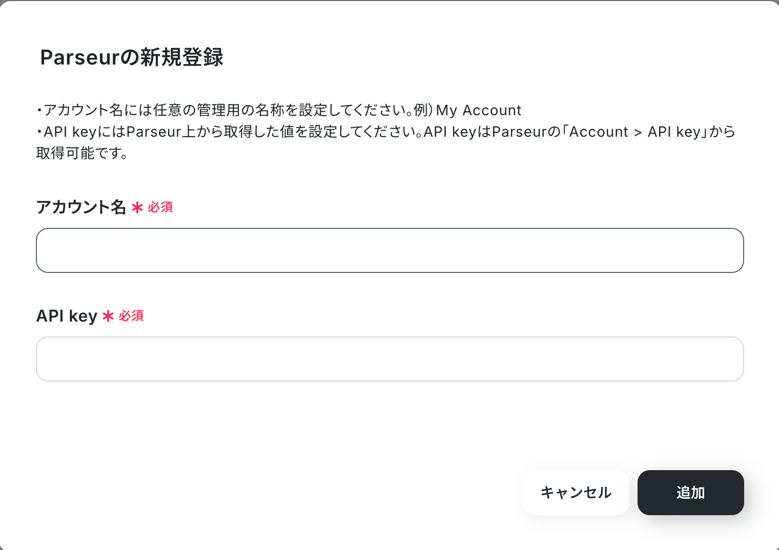 以下の画面が表示されるので、アカウント名とAPI keyを注釈に沿って入力し、「追加」をクリックしましょう。
