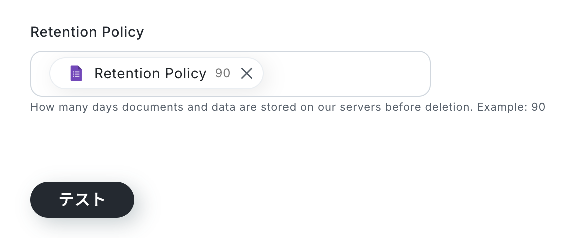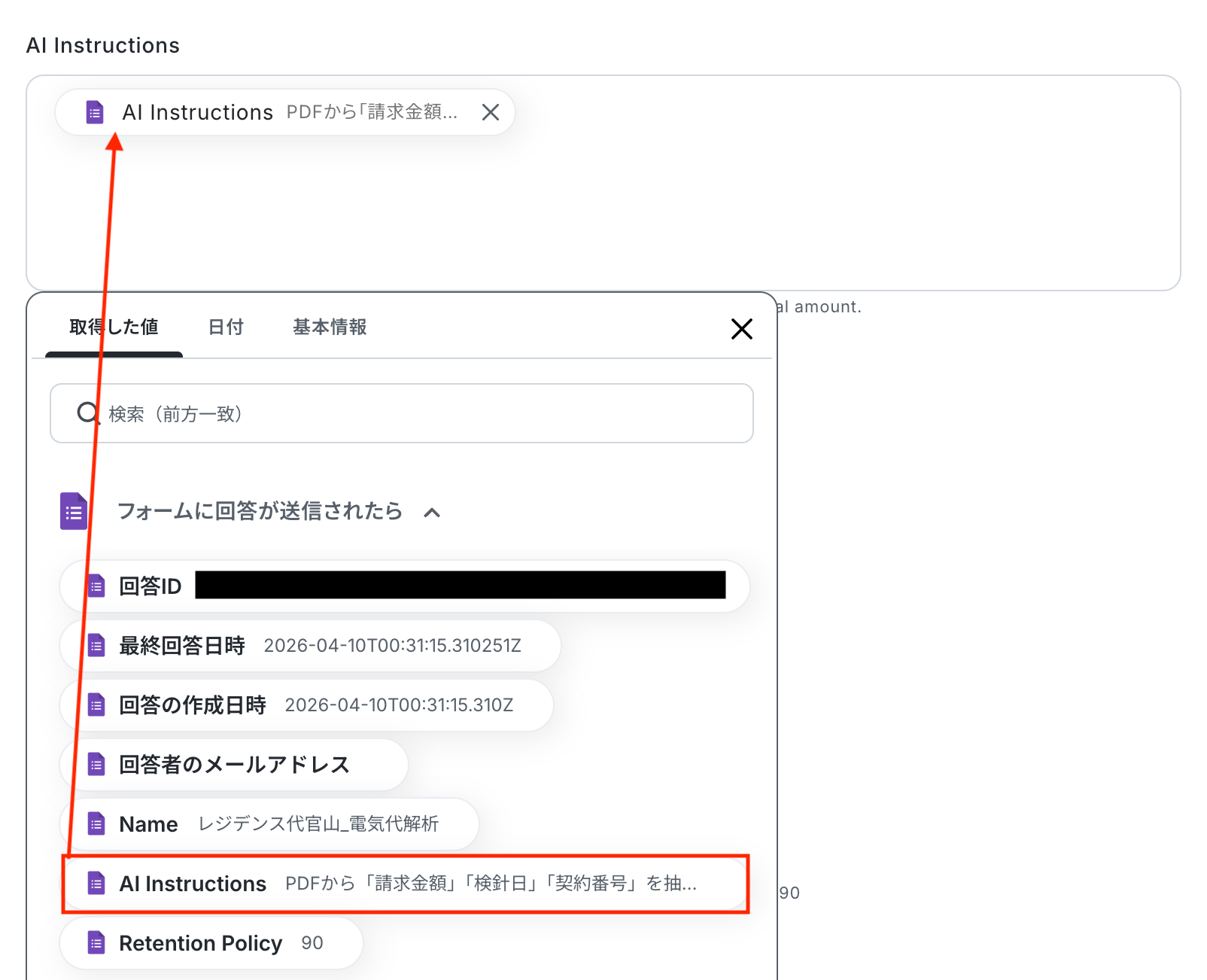 たとえば、フォームで取得した値をもとに「Name」にメールボックス名を設定したり、「AI Instructions」に抽出したい項目や指示内容を設定したりできます。 また、「Retention Policy」に保存期間を反映することも可能です。