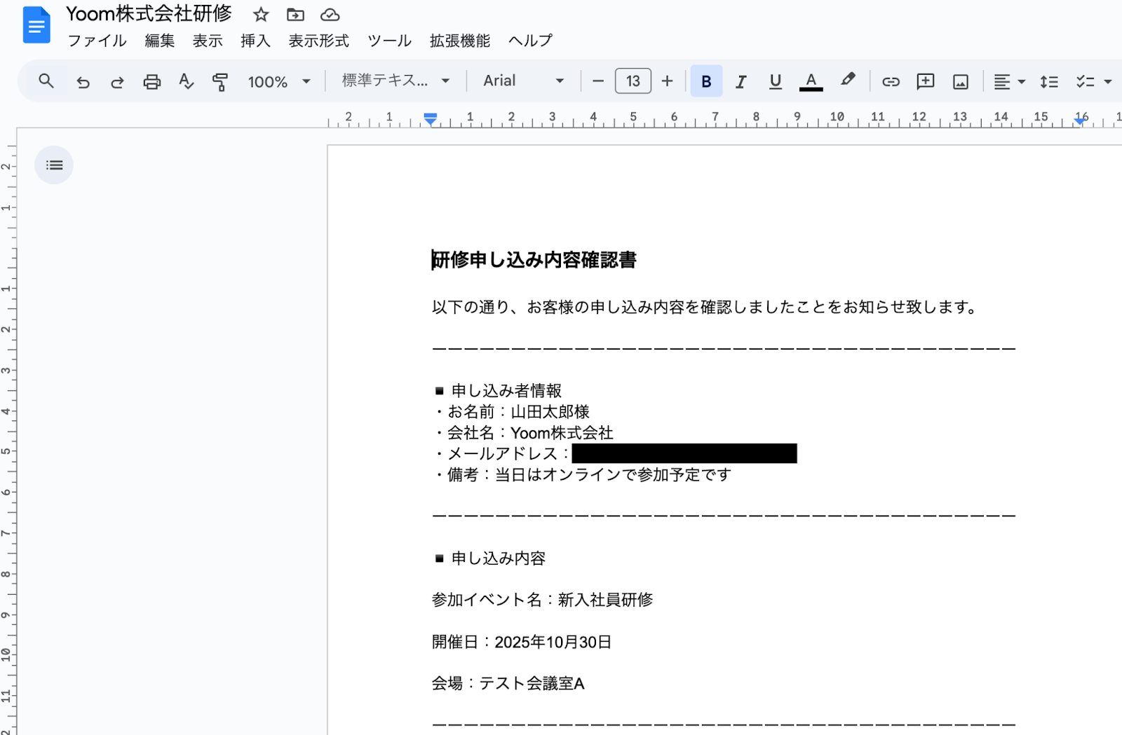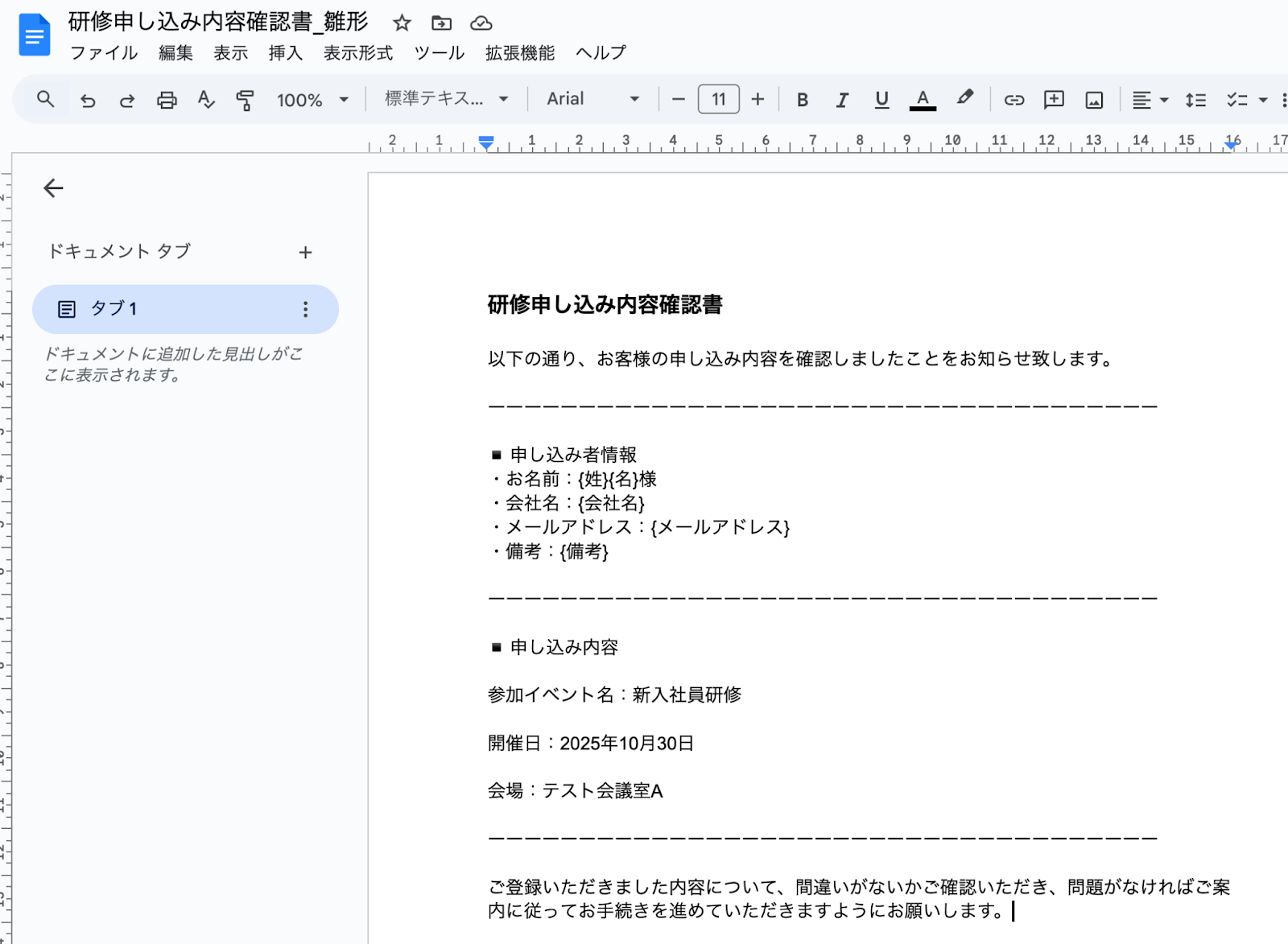 雛形に沿って、Googleフォームの回答内容を反映した書類ができました!