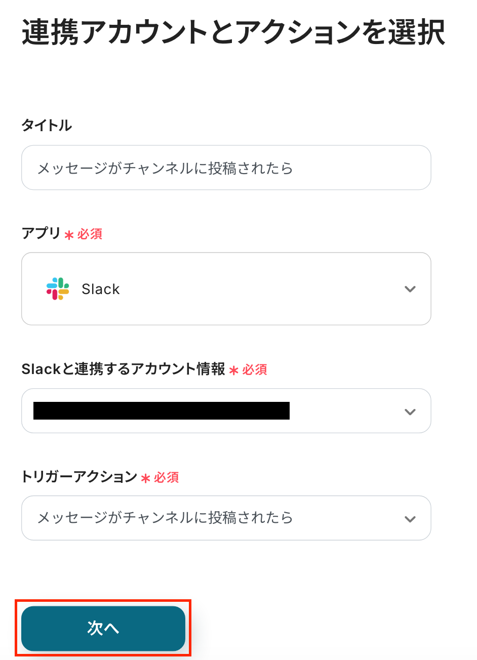 - 「トリガーアクション」:「メッセージがチャンネルに投稿されたら」を選択