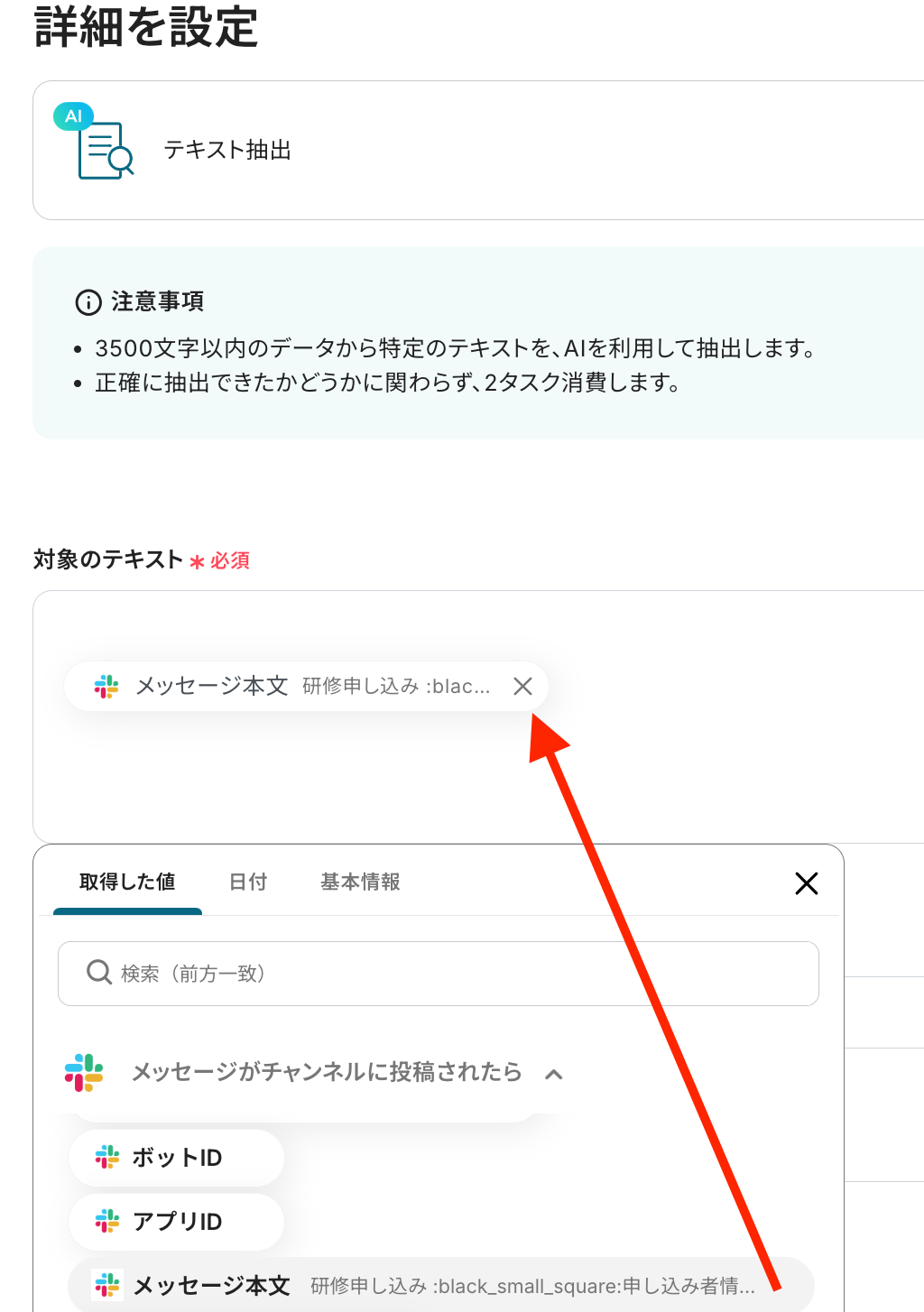対象のテキストにSlackのメッセージ本文を選択しました。
