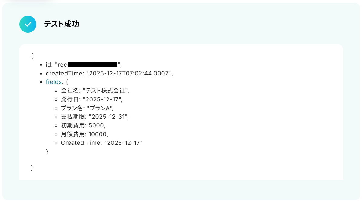 次に、テキストボックス下部の説明通りにベースID・テーブルID・Created Timeのフィールド名を入力してテストしましょう。