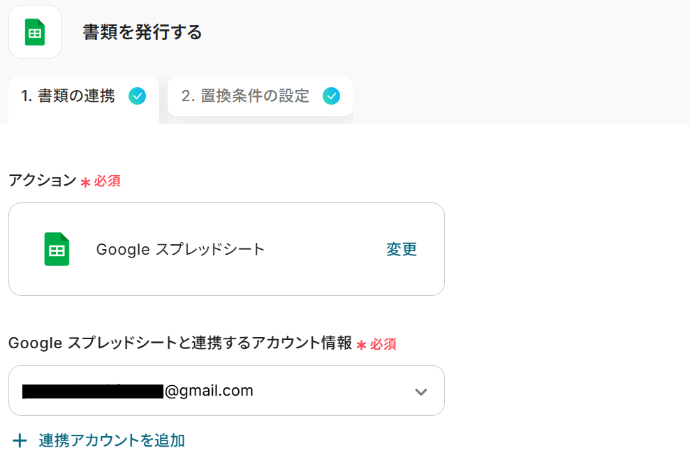 - 次に、オペレーションでGoogle スプレッドシートの「書類を発行する」アクションを設定し、Airtableから取得したデータを紐付けます。