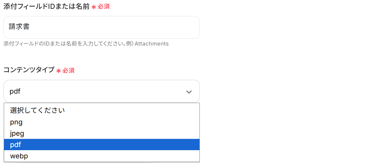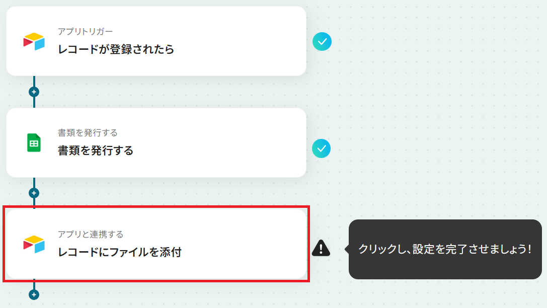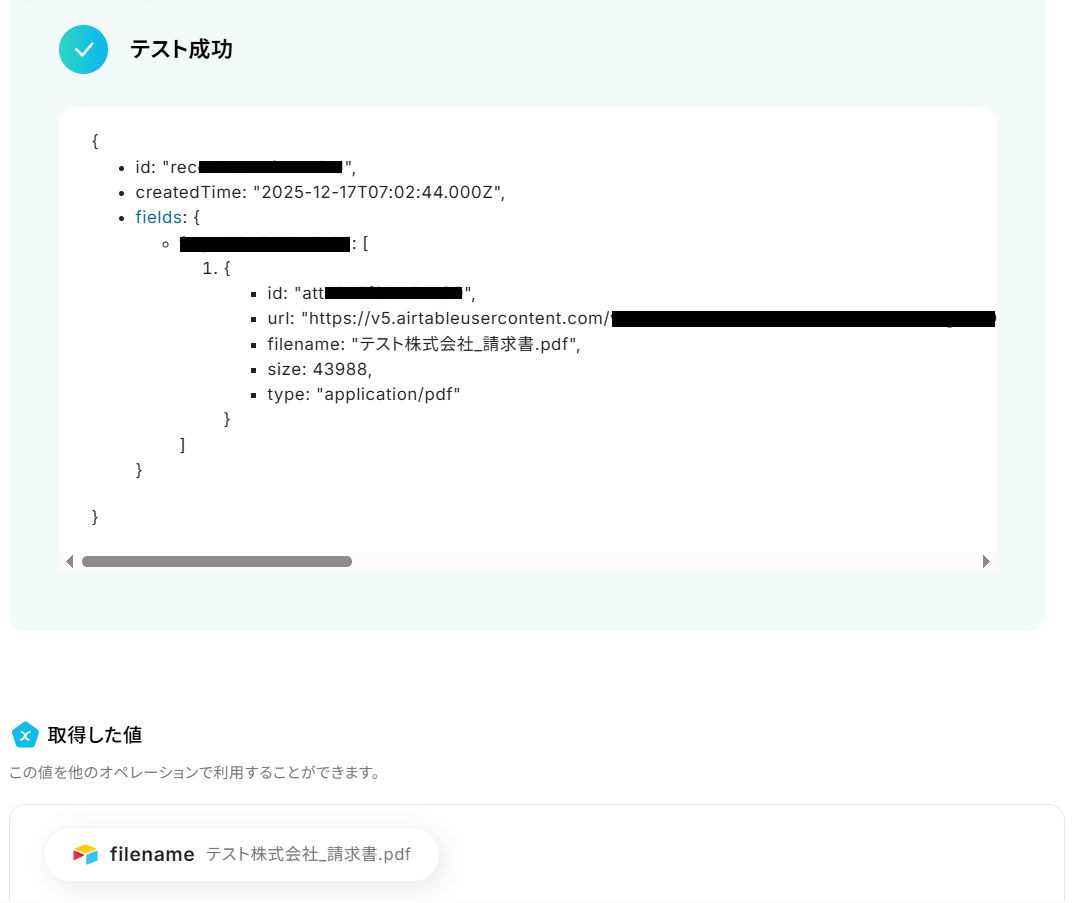- 最後に、オペレーションでAirtableの「レコードにファイルを添付」アクションを設定し、発行したPDF書類を対象のレコードに添付します。