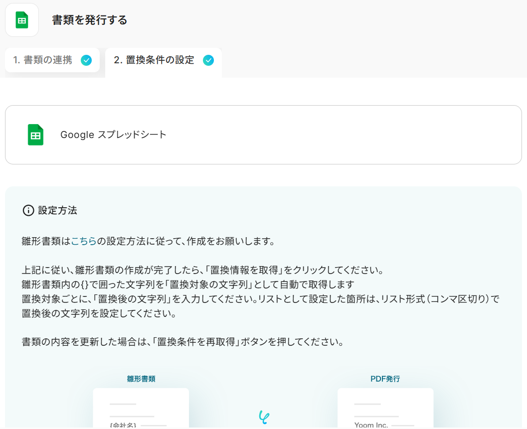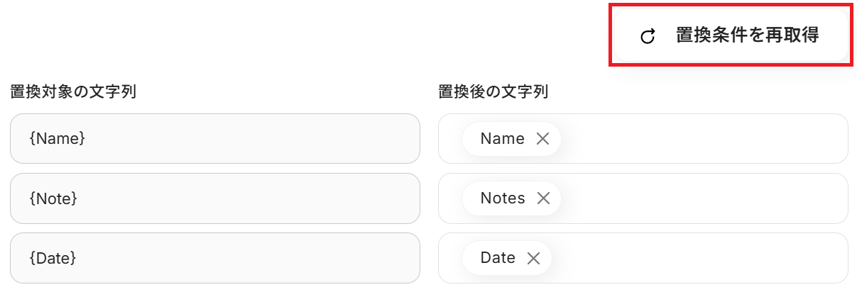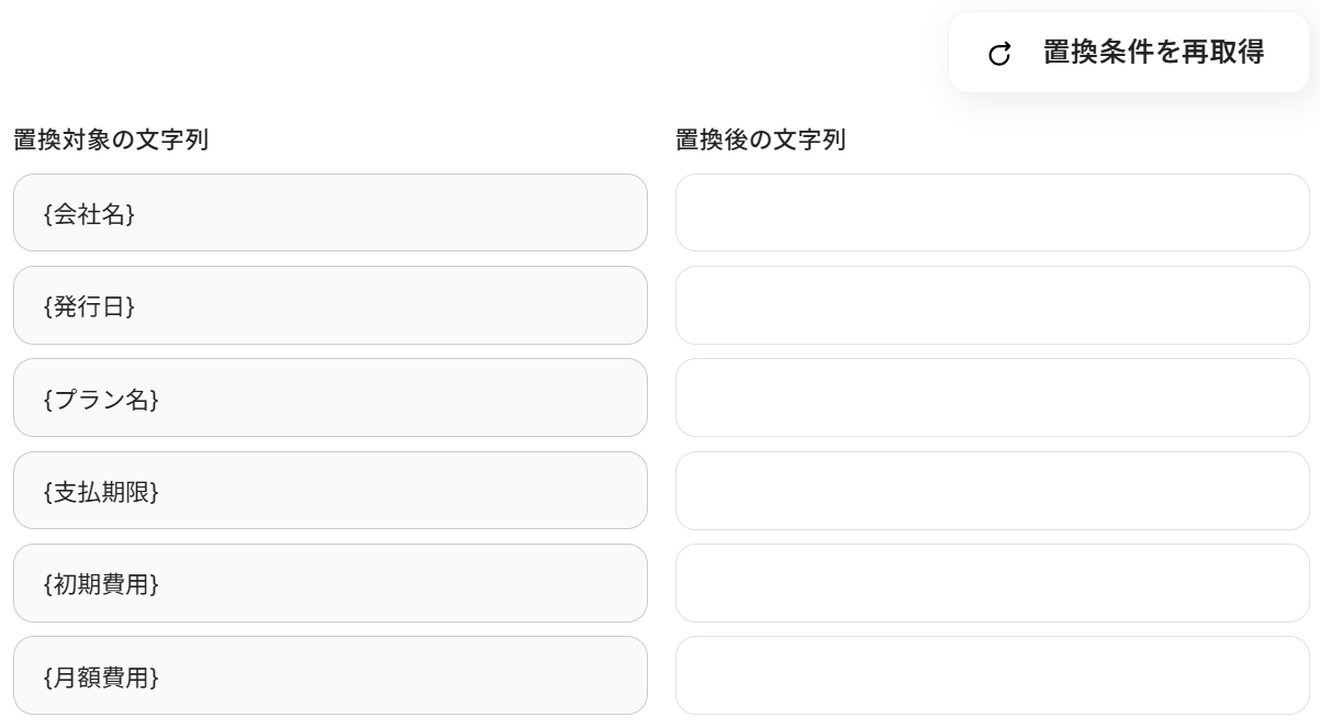 まずデフォルトで置換対象の文字列が並んでいますが、これが雛形の項目と合っていない場合は「↻ 置換条件を再取得」をクリックしてください。