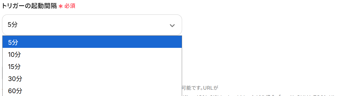 - トリガーは5分、10分、15分、30分、60分の間隔で起動間隔を選択できます。