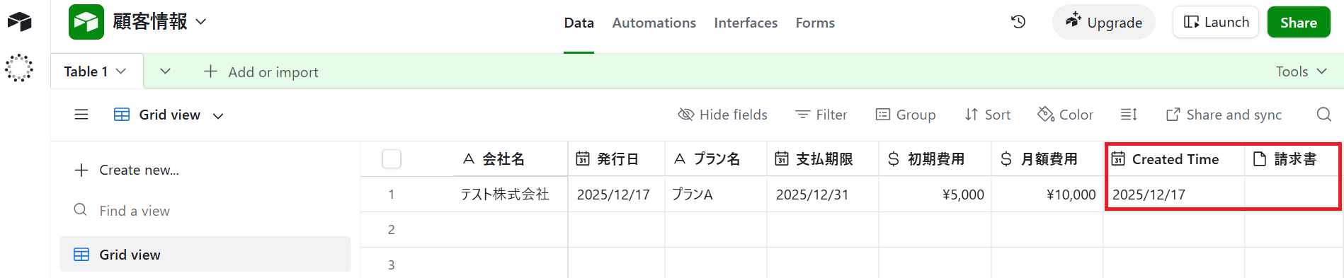 ※今回は「Created Time」という名称を使ってテーブルを作成しましたが、他の名称でも問題ありません。