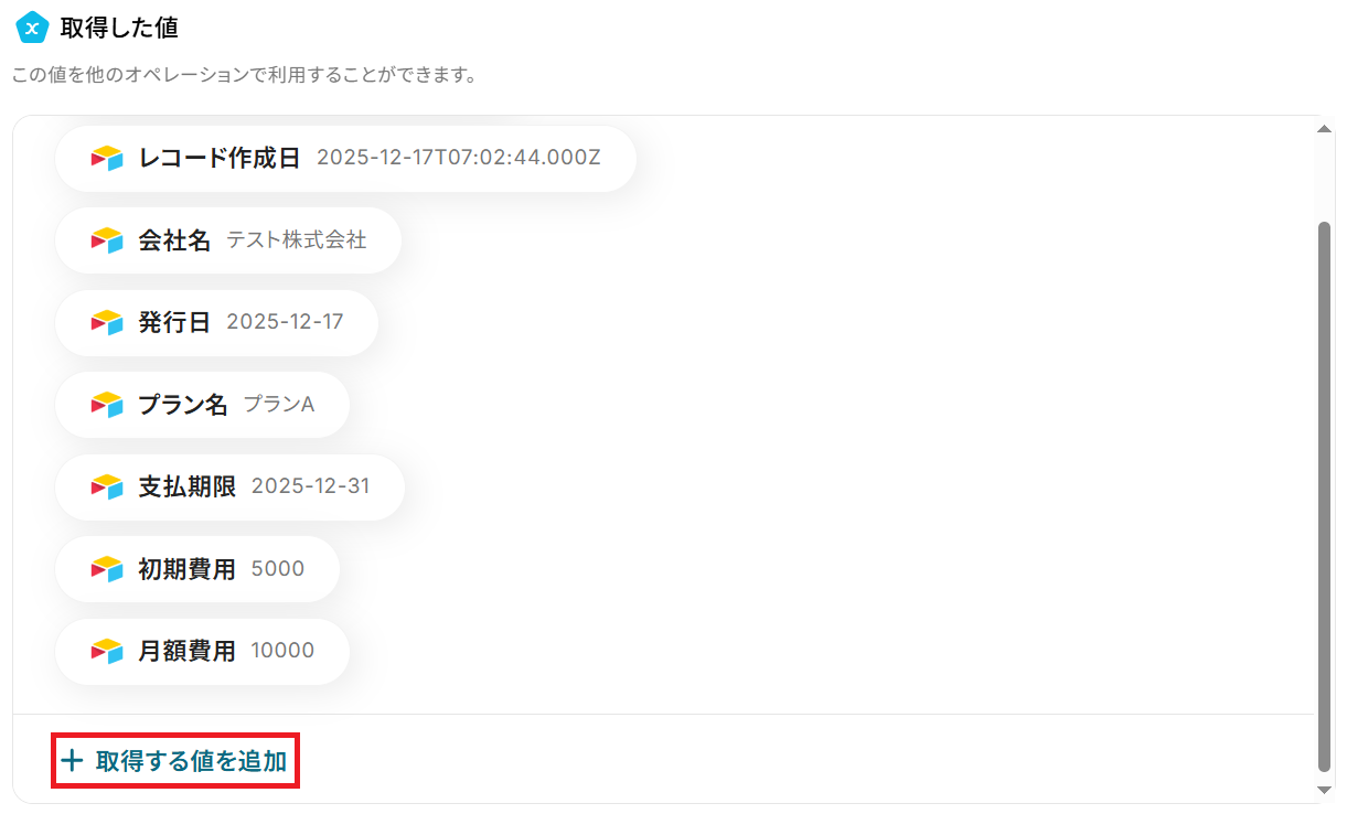 その場合「+ 取得する値を追加」から項目を追加できます。「取得する値」を追加する方法